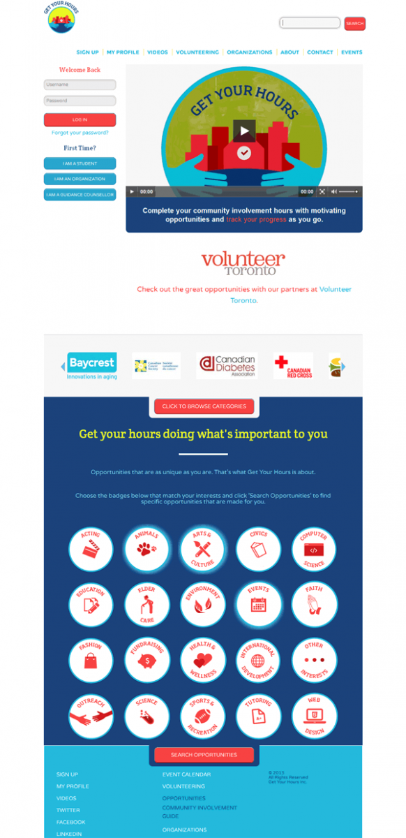 Get Your Hours is a platform built to help students keep track of their volunteer hours. It contains tools for high school students to view how many hours they have left until meeting their graduation requirements. Students may also apply to positions with participating charities. Get Your Hours is partnered with the Toronto District School Board, Toronto Catholic District School Board, and Volunteer Toronto.